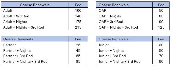 The committee is pleased to announce that it will be holding membership fees unchanged for the coming year, with the exception of adult night tickets and 3rd rod tickets, which will both be increased by £5 and Partner night tickets, which will be increased by £3. We remain committed to being a low-cost, general fishing club but inevitably our costs of running your club continue to increase year on year.